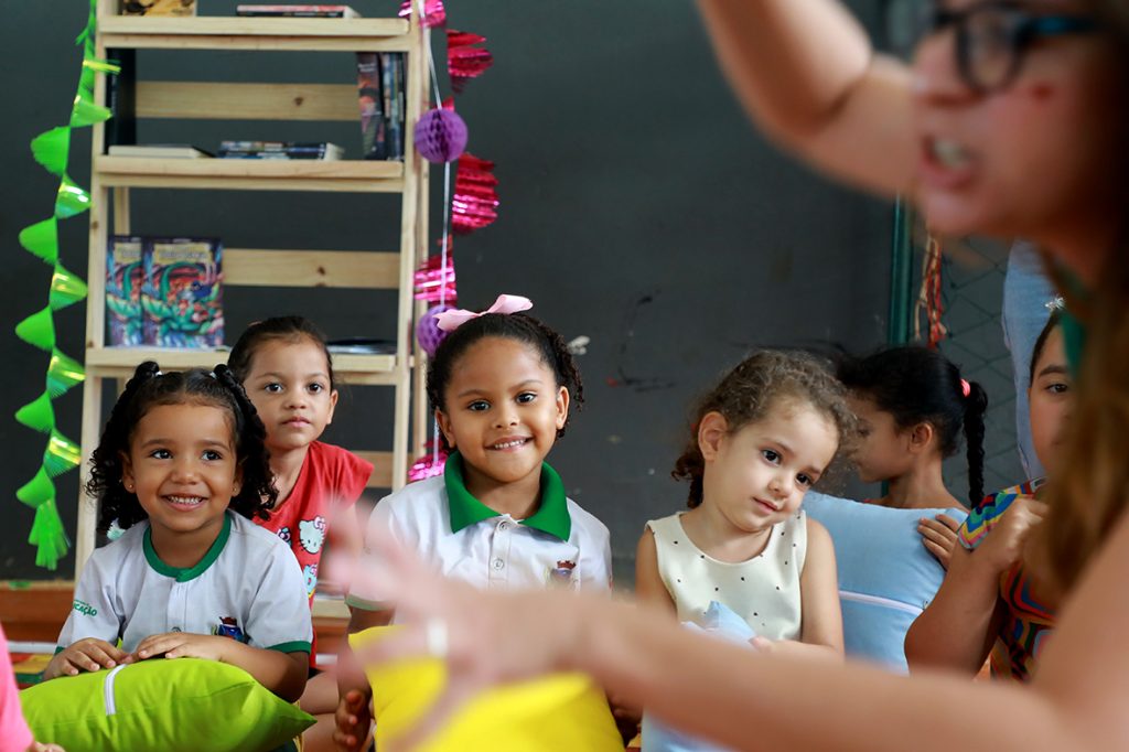 As crianças participaram das atividades da gibiteca itinerante e curtiram sessões de contação de histórias com as monitoras do projeto, que através de uma abordagem lúdica apresentaram contos que estimulam a imagem e ajudam na formação de novos leitores.